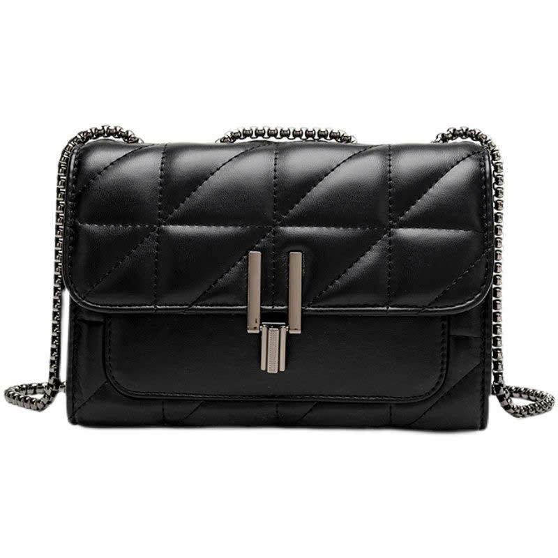 The bag comes with a refined black metal chain strap intertwined with leather, offering durability and a sophisticated look. It can be worn as a shoulder bag or crossbody, making it versatile for daily use or evening occasions. The minimalist metal clasp at the front enhances the clean, contemporary aesthetic while keeping the bag securely closed.