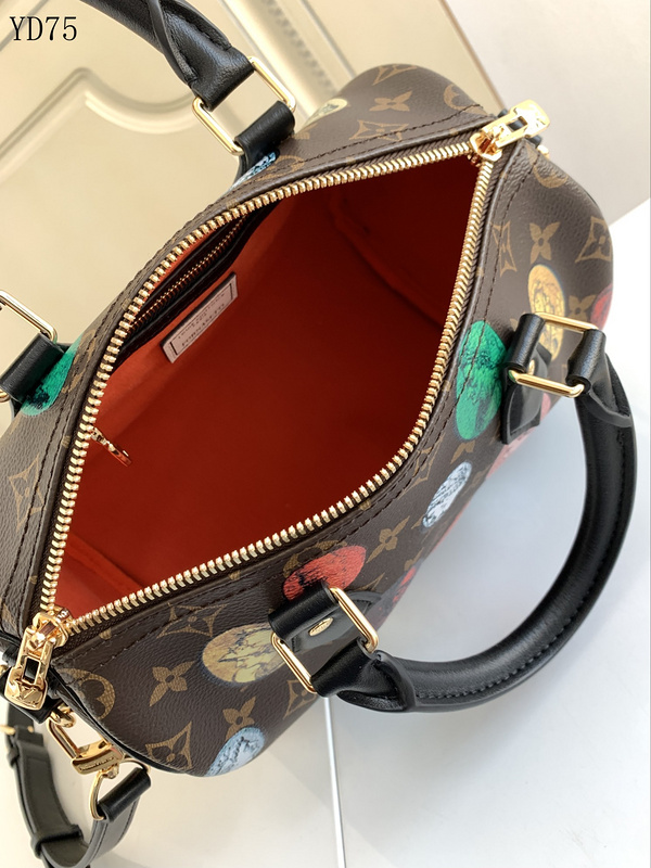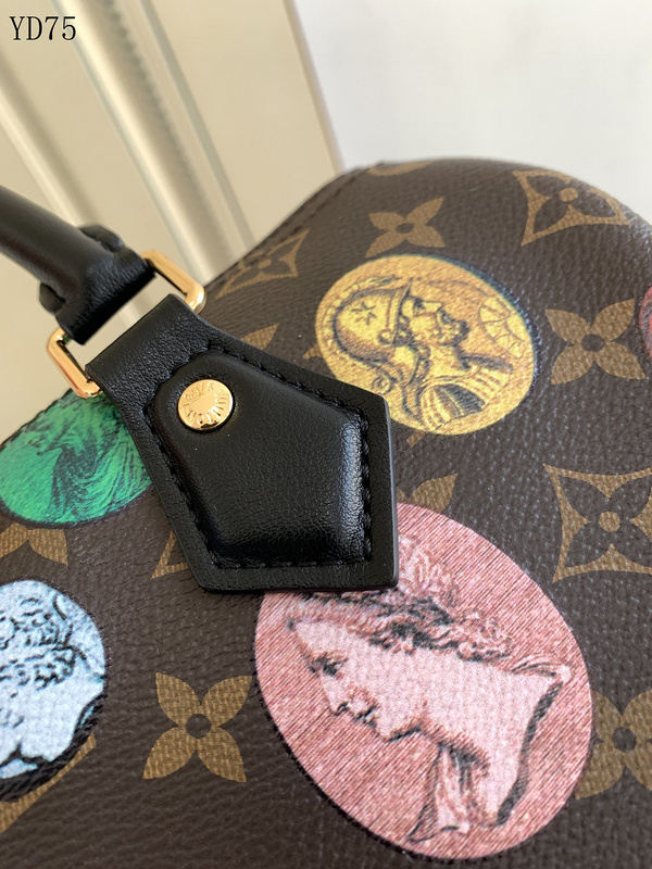 Original single M45910 silk-screened speedy pillow bag series Nicolas Ghesquière innovated the Speedy Bandoulière 25 handbag in the autumn-winter 2021 series, with Monogram canvas reflecting the coin pattern of Italian artist Piero Fornasetti, with rolled leather handle and logo-inscribed padlock.