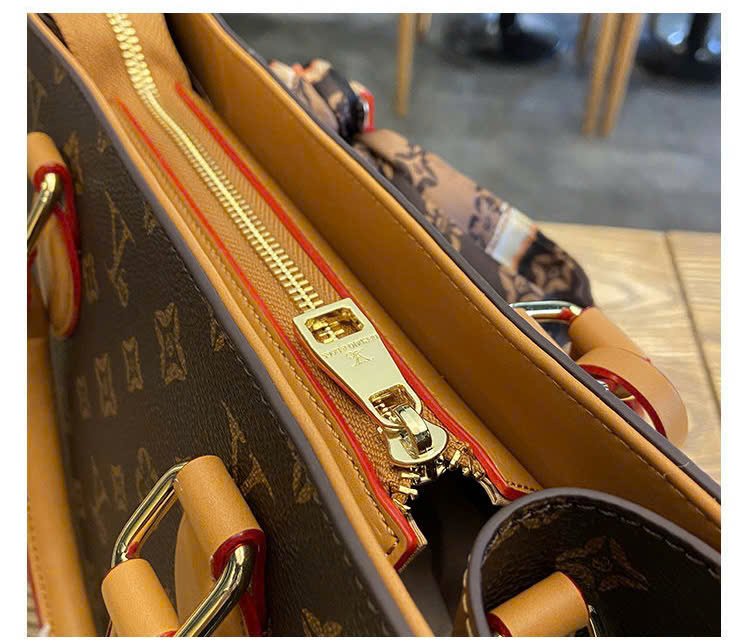 The bag comes with dual leather top handles in a warm caramel shade, offering a comfortable handheld carry. It also includes a detachable and adjustable long strap, allowing you to wear it as a shoulder bag or crossbody for added convenience. The decorative silk scarf and leather tag charm add a fashionable touch, enhancing the overall premium look.