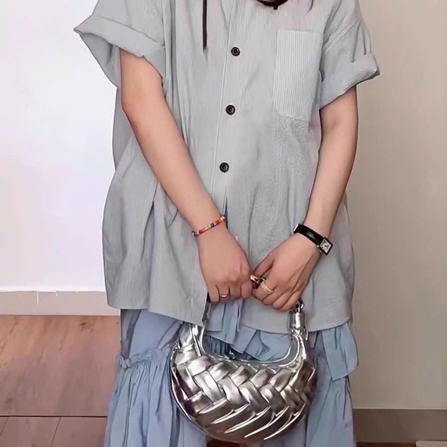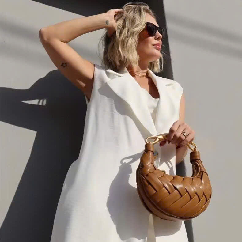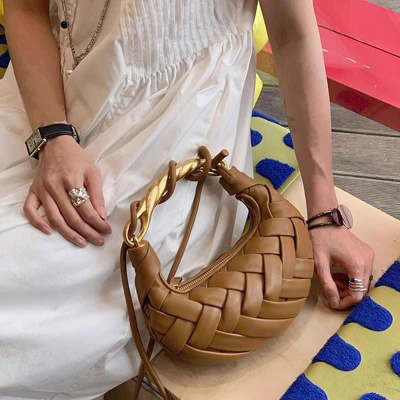 This bag features a unique crescent shape with an eye-catching, fully woven leather design that creates a soft, luxurious texture. The warm caramel-brown tone makes it versatile and elegant for everyday styling. The top handle is beautifully crafted with a twisted metallic gold detail, adding a bold, high-fashion touch to the overall look.