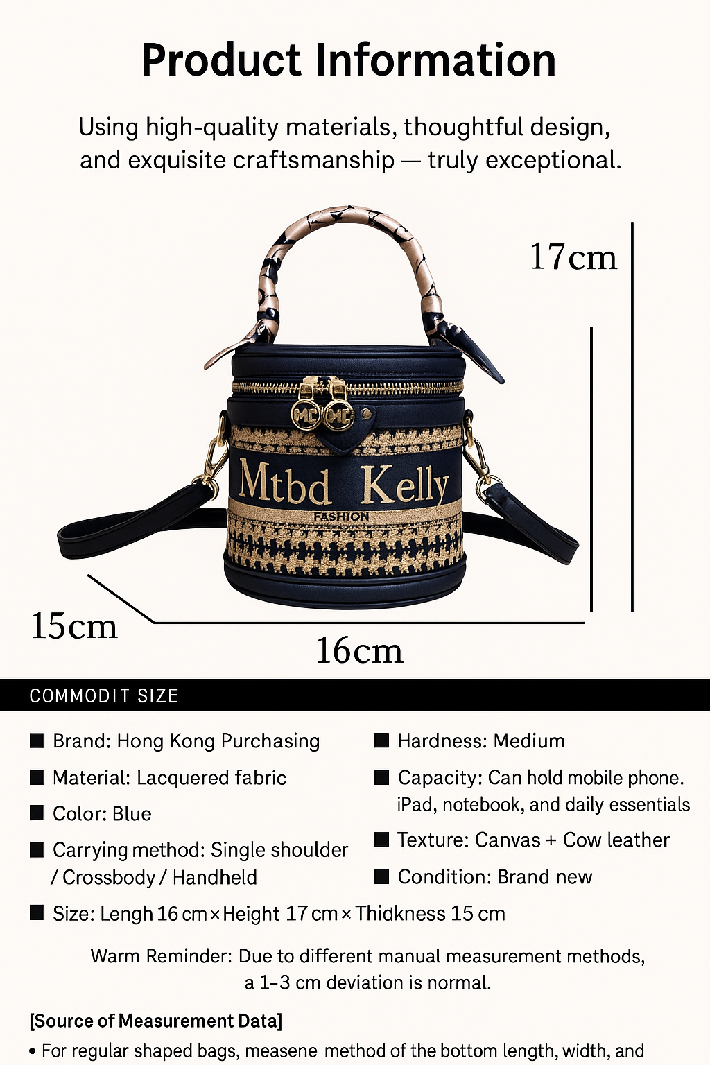 FREESHIPPING - This stylish cylindrical handbag features a unique blend of modern fashion and classic craftsmanship. The body of the bag is designed with a woven canvas pattern accented by premium cow leather, creating a luxurious texture that feels both elegant and durable. The navy blue tone combined with beige woven detailing brings a sophisticated contrast, making the bag stand out effortlessly.