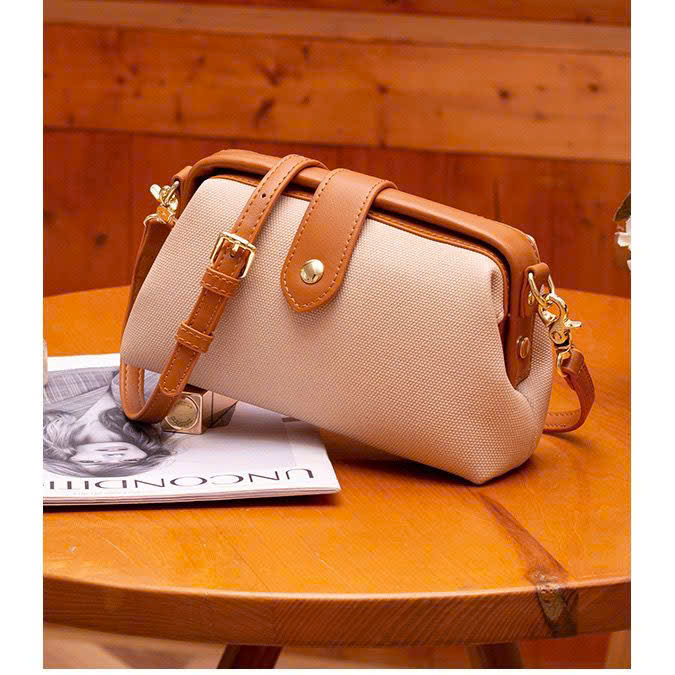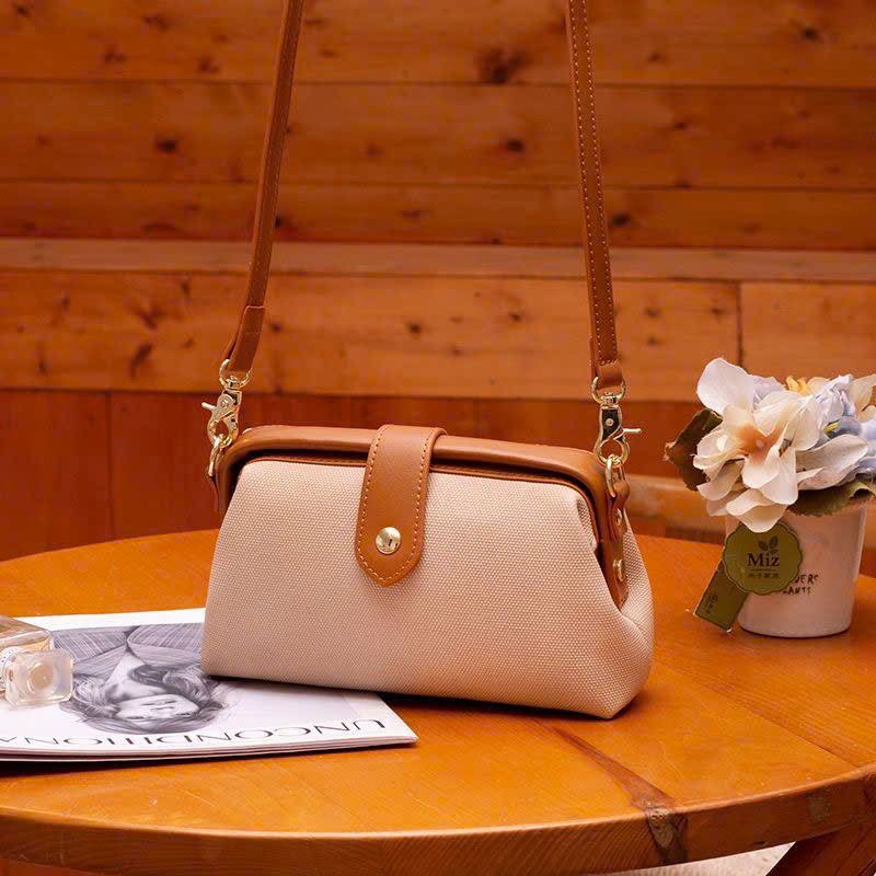 Golden hardware details complement the warm tan leather accents, giving the bag a chic and polished appearance. Perfect for outings, dates, café trips, or casual daily use, this mini canvas-leather bag adds a charming and feminine touch to any outfit.